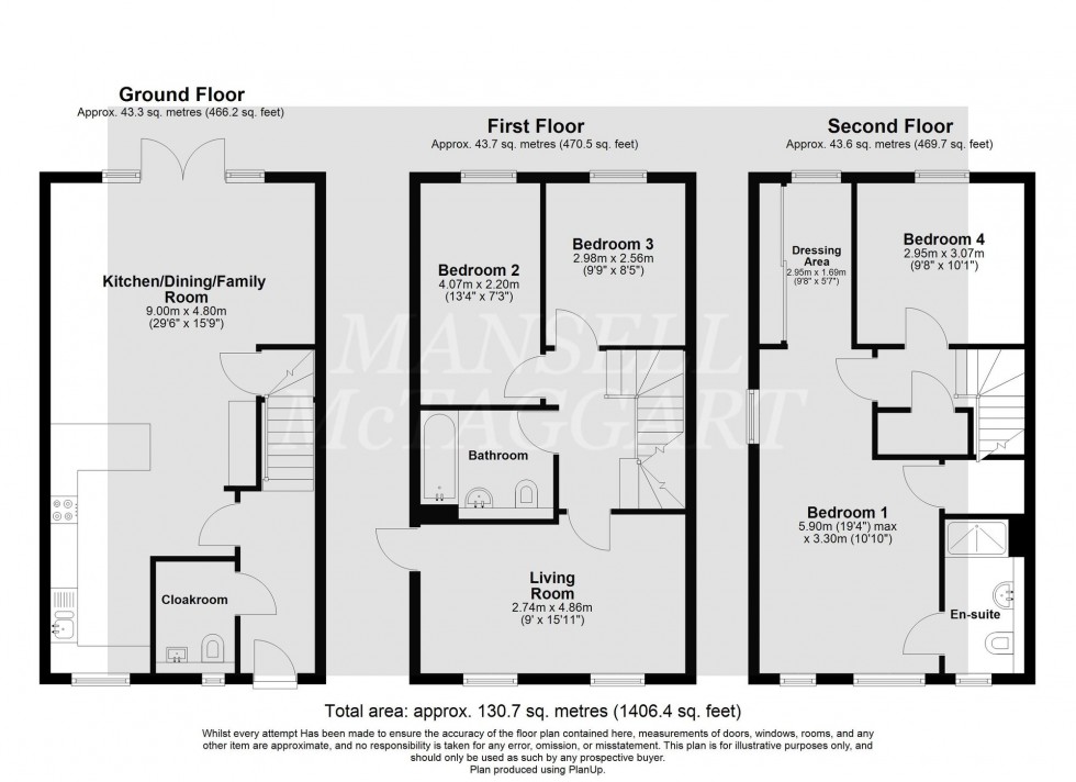 The ground floor has a welcoming hallway that leads to the open-plan kitchen, dining & family room that occupies the full ground floor. The kitchen features an attractive breakfast bar, integrated appliances including, gas hob, oven, microwave, washing machine, dishwasher and fridge/freezer and double French doors onto the garden. This floor is completed by a convenient storage cupboard and cloakroom.